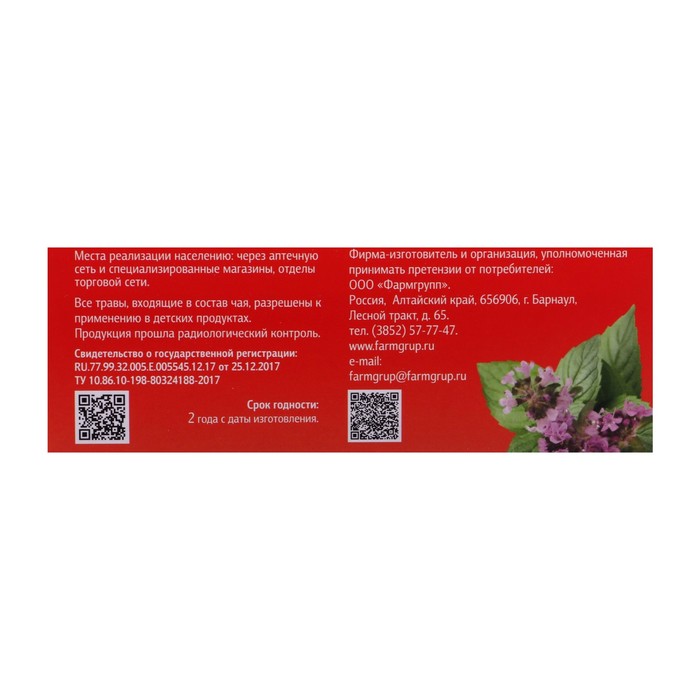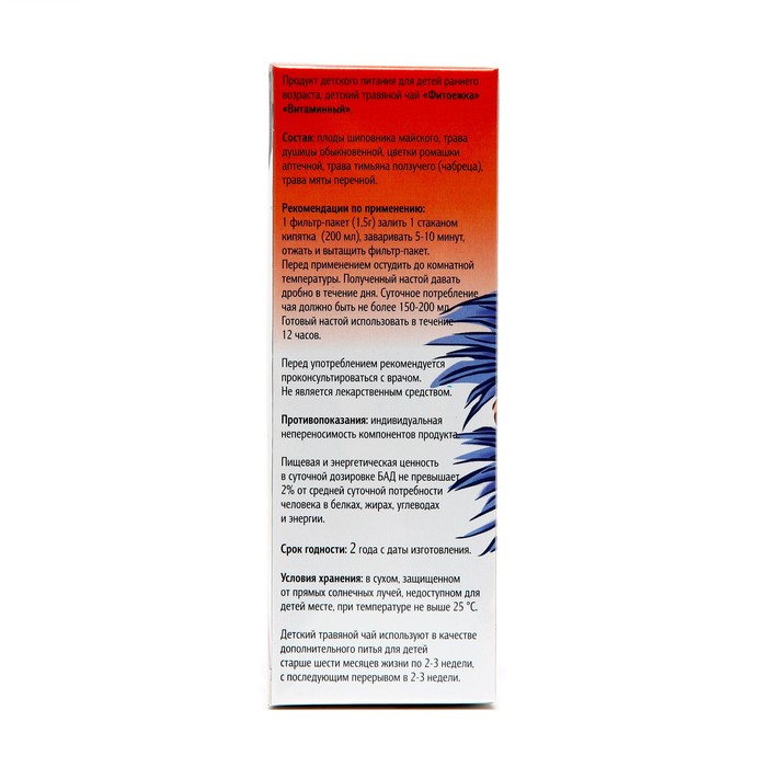 Состав: цветки ромашки аптечной, трава душицы обыкновенной, плоды шиповника майского, трава тимьяна ползучего (чабреца), трава мяты перечной.