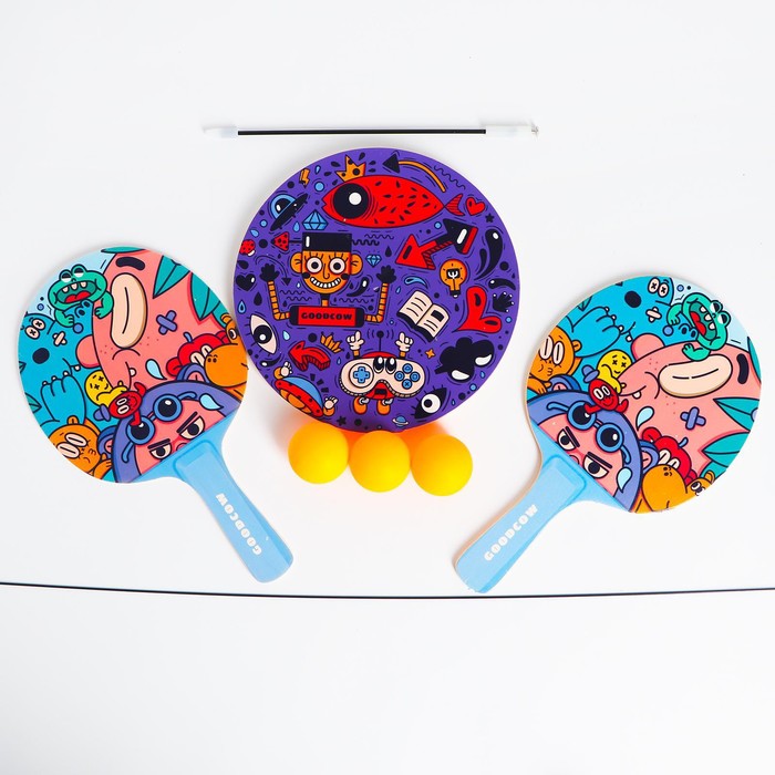 В комплекте: деревянная основа, гибкий штырь для шарика (может гнуться без деформации до 180 градусов), 2 ракетки, 3 шарика для пинг-понга.