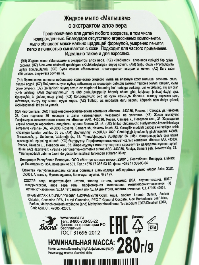 Предназначено для детей любого возраста, в том числе новорожденных. Благодаря отсутствию агрессивных компонентов мыло обладает максимально щадящей формулой, умеренно пенится, легко и полностью смывается с кожи. Подходит для частого применения.