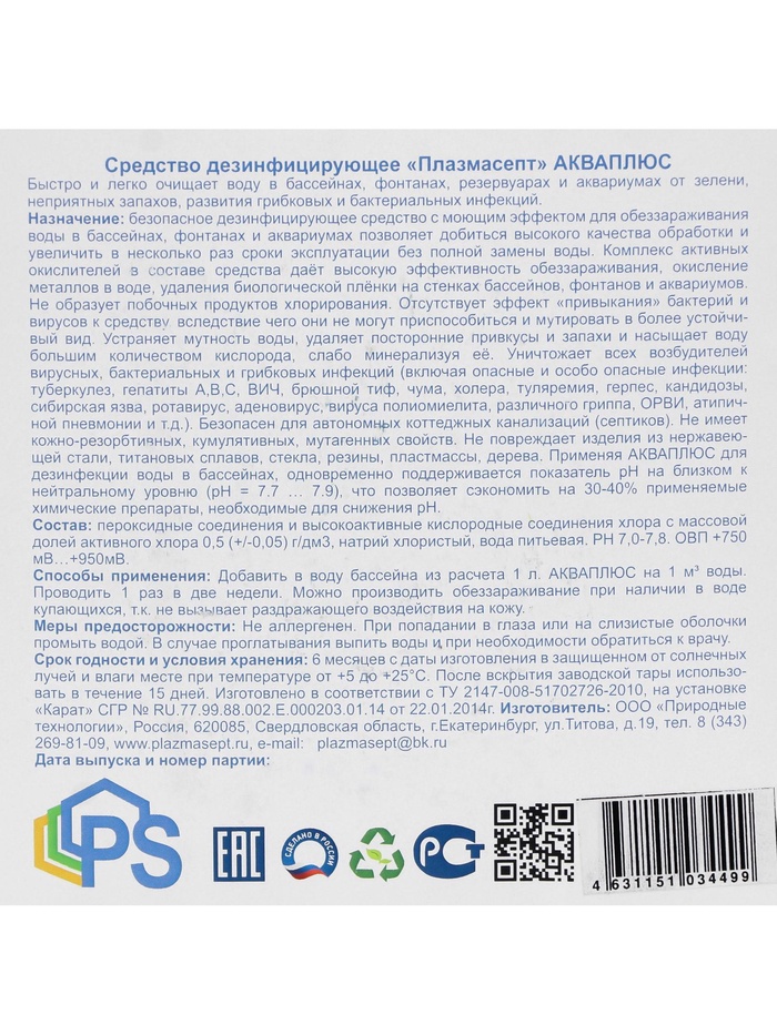 Способы применения: Добавить в воду бассейна из расчета 1 л. Акваплюс на 1 м3 воды. Проводить 1 раз в две недели. Можно производить обеззараживание при наличии в воде купающихся, т.к не вызывает раздражающего воздействия на кожу.
