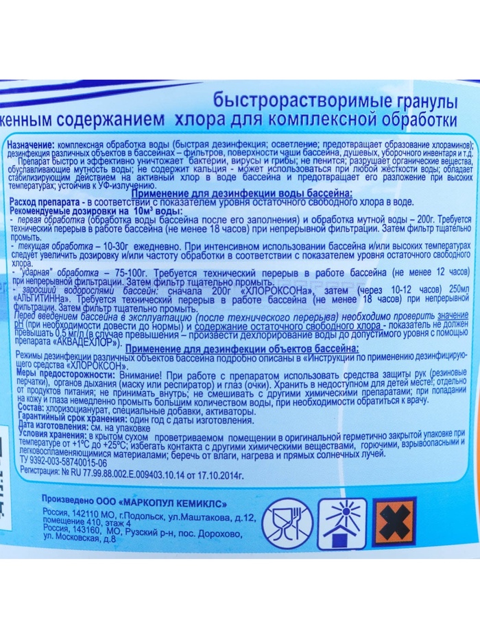 Препараты Маркопул Кемиклс Хлороксон представляют собой комплексные средства эффективно использующиеся против широкого спектра микробов, бактерий, а также вирусов. Не содержат кальция, могут использоваться при любой жёсткости воды, не пенятся, рН – нейтральны, обладают стабилизирующим действием на активный хлор в воде бассейна и предотвращают его разложение при высоких температурах. Имеют высокую устойчивость к УФ-излучению. Применяются как в бассейнах с песчаными, так и с катриджными фильтрами.