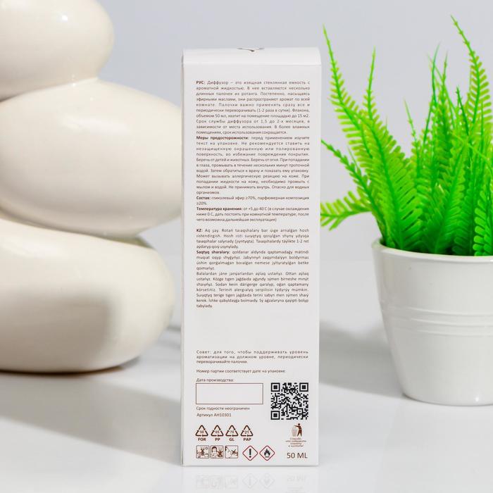 В комплект входят ротанговые палочки, благодаря которым ароматическая композиция распространяется по воздуху. Диффузор рассчитан на помещение площадью до 15 м², интенсивность аромата регулируется количеством палочек.