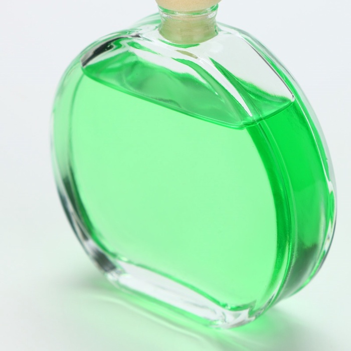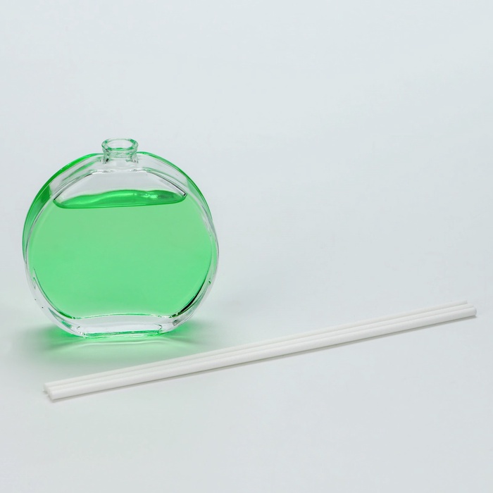 Диффузор выполнен в виде стеклянной бутылочки круглой формы, украшенной изображением цветов. В комплект входят палочки из натурального материала, которые впитывают аромат и распространяют его по комнате.