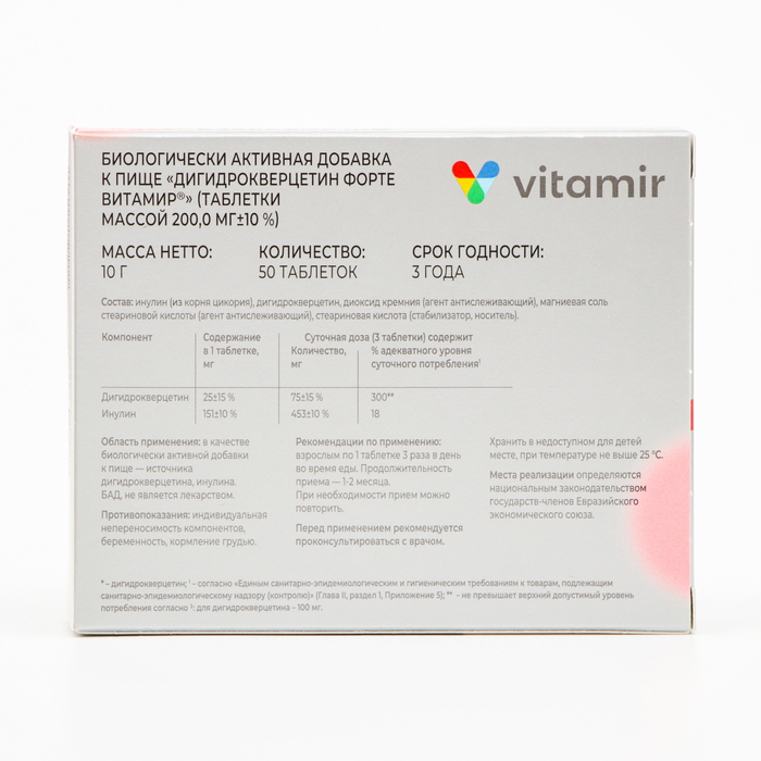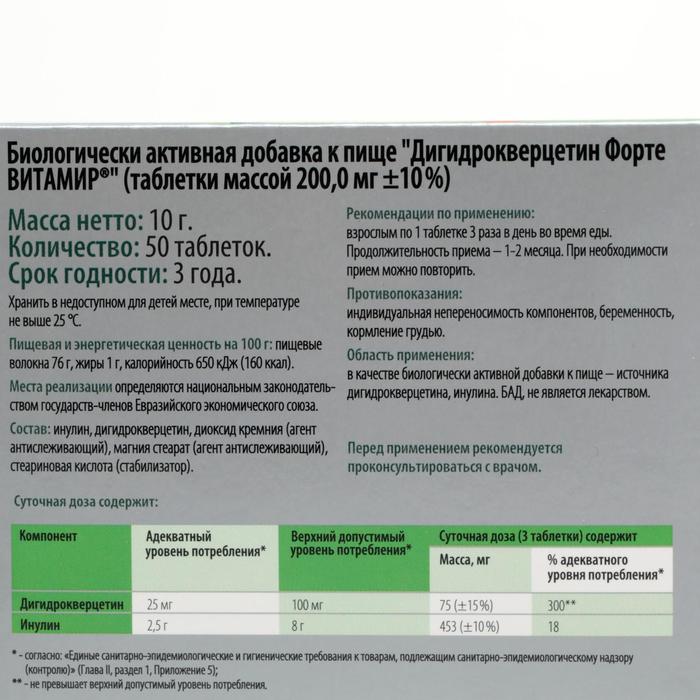 Состав: инулин, дигидрокверцетин, магния стеарат (агент антислеживающий), стеариновая кислота (стабилизатор).