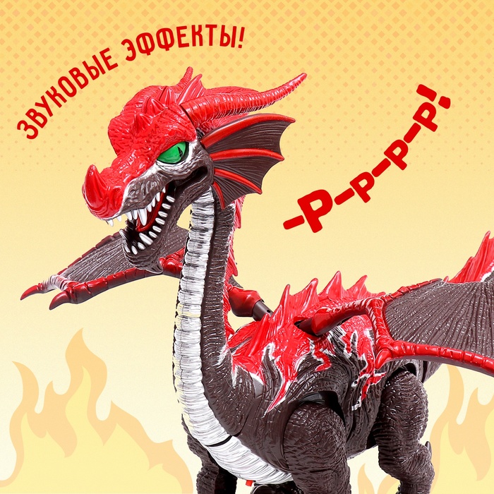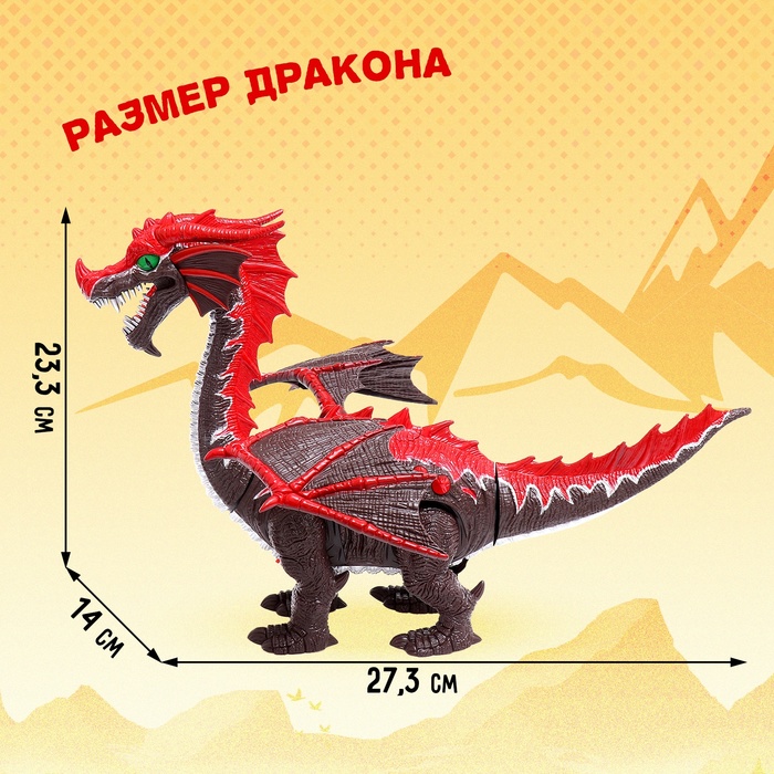 Динозавр в виде дракона — это увлекательная интерактивная игрушка для детей от 3 лет. Она оснащена множеством функций: издаёт звуки настоящего динозавра, мигает цветными огнями, двигает хвостом и крыльями, а также может передвигаться с помощью электрического привода.