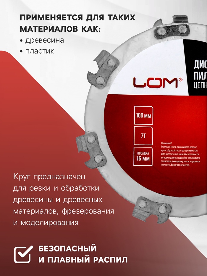 Изделие оснащено по окружности пильной металлической цепью, которая обеспечивает плавность и точность реза.
