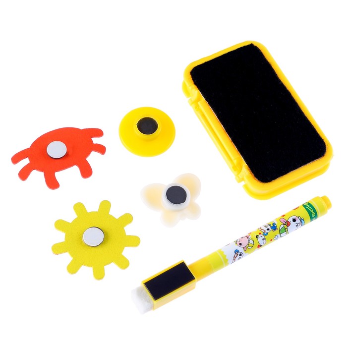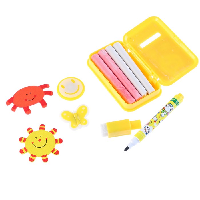Доска выполнена из пластика. Одна сторона предназначена для рисования мелками, а магнитная поверхность — для рисования водными маркерами. В комплект входят яркие магниты, мел, губка для стирания, водный маркер.
