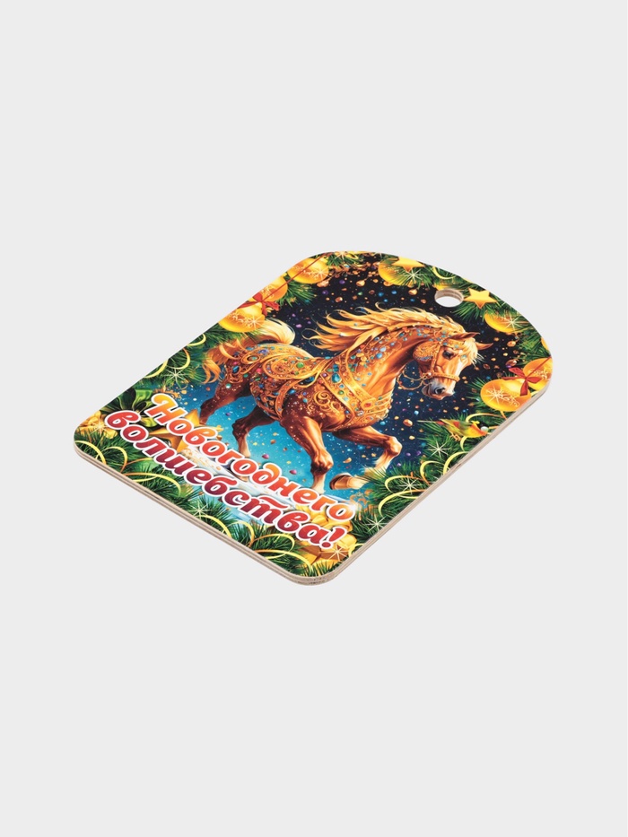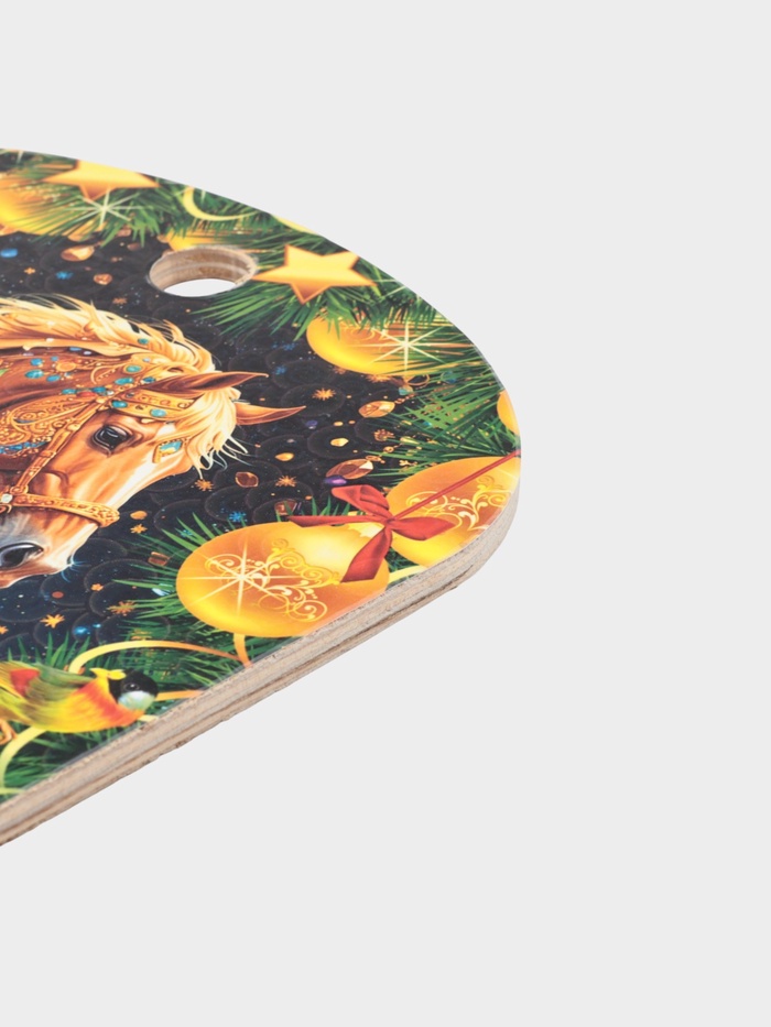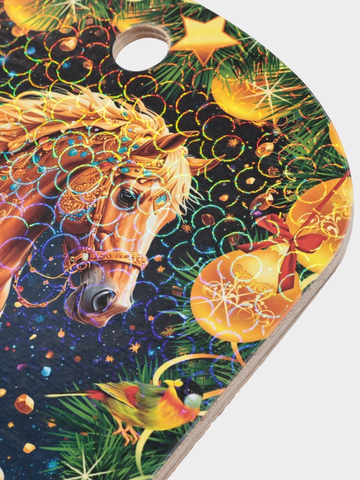 Разделочная доска «Символ года: Лошадь» — это праздничный акцент, сочетающий практичность и уважение к традициям. На ней изображена лошадь — символ 2026 года — в атмосфере новогоднего волшебства: с гирляндами, снежинками и мягким зимним светом. Доска подойдёт для нарезки сыра, фруктов или овощей к праздничному столу, а после — легко превратится в украшение: её можно повесить на стену или дверцу кухонного шкафа, чтобы подчеркнуть наступление нового цикла.