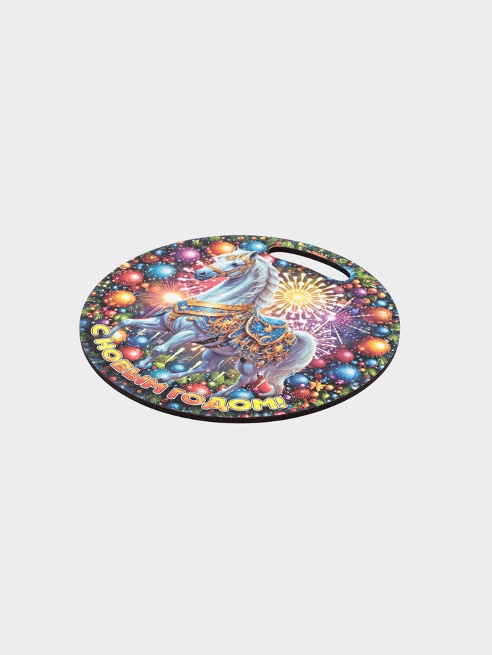 Круглая форма традиционно ассоциируется с завершённостью, гармонией и полнотой жизни. В сочетании с образом лошади — символа упорства, верности и удачи — эта доска становится не просто кухонным аксессуаром, а мягким напоминанием: новый год — время для обновления, тепла и простых радостей. Подарите её близкому человеку — пусть каждый взгляд на неё вдохновляет и согревает простым, но важным пожеланием: ”С Новым годом!“.