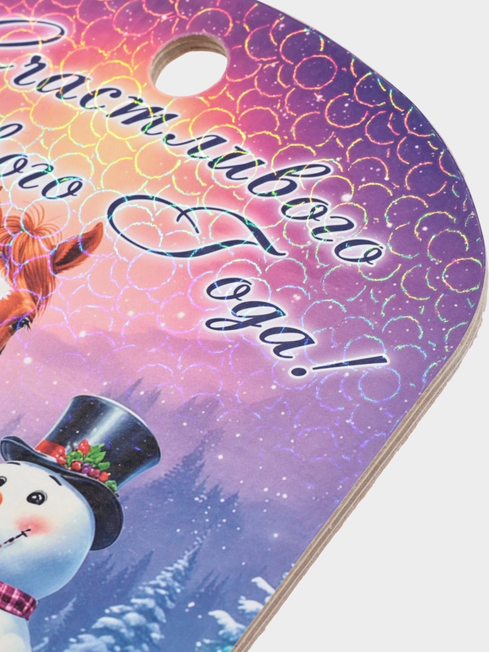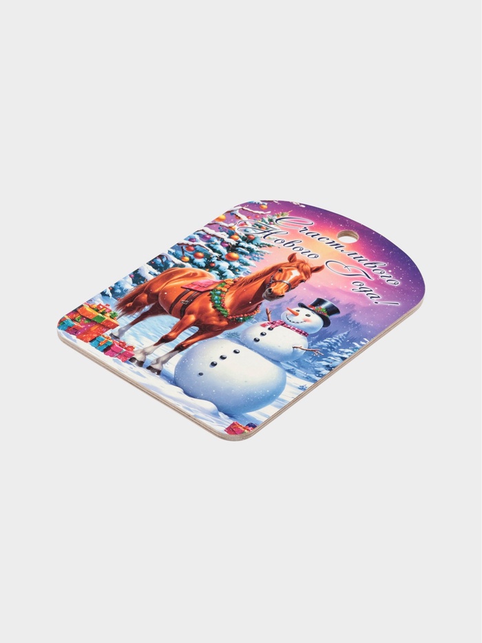 Разделочная доска «Символ 2026 года: Лошадь» — это тёплый новогодний акцент, сочетающий домашнюю практичность и уважение к традициям восточного календаря. На её поверхности — яркая лошадь, символ наступающего года, в окружении праздничных узоров и пожелания ”Счастливого Нового года“. Доска подойдёт для нарезки сыра, фруктов или овощей к праздничному столу, а после — легко станет частью зимнего декора благодаря подвесной конструкции.