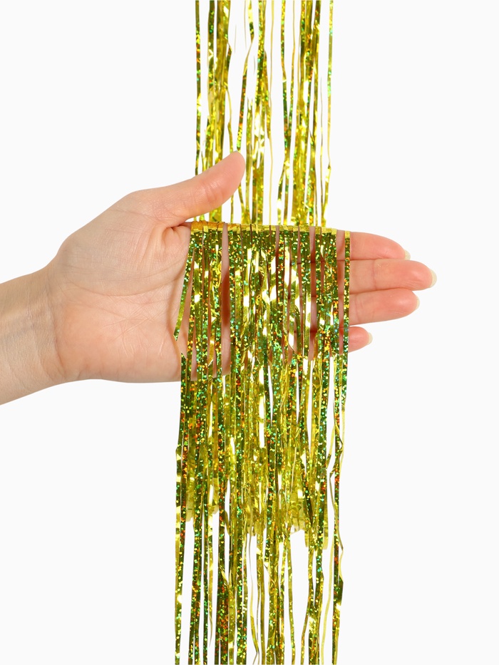 Этот дождик превращает ёлку и комнату в пространство зимнего торжества и семейного тепла. Золотые полосы работают как фон или центральный акцент, создавая атмосферу покоя и светлого ожидания праздника. Используйте его как основу убранства или как дополнение к другим элементам — он одинаково хорошо усиливает дух Нового года и уют предпраздничных дней.