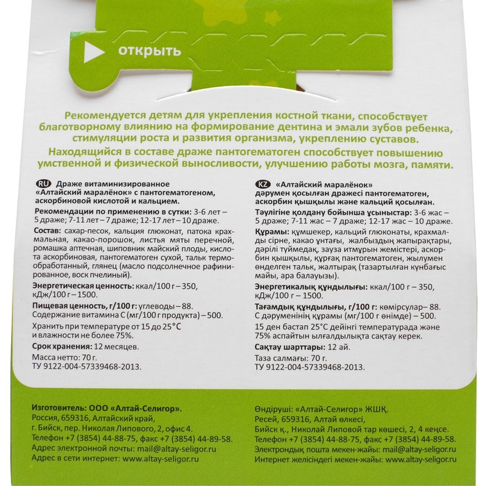 Драже «Алтайский маралёнок» рекомендуется детям для укрепления костной ткани, стимуляции роста и развития организма. В состав входит пантогематоген, который повышает выносливость и укрепляет иммунитет. Это 100 % натуральный продукт без консервантов и вредных добавок.