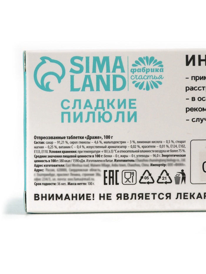 Состав: сахар 91,21%, сироп глюкозы 4,6%, мальтодекстрин 3%, лимонная кислота 0,5%, стеарат магния 0,25%, витамин С 0,4%, искусственный ароматизатор 0,02%, красители 0,01%, Е124, Е102, Е133, Е110.