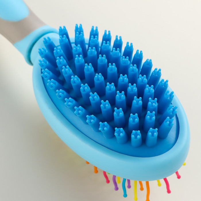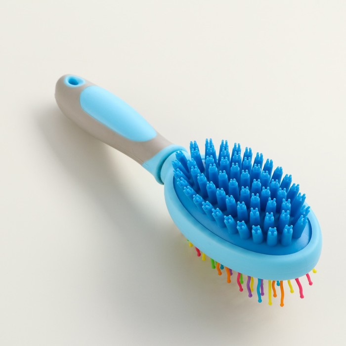 Прочные металлические зубчики (жесткая сторона) для распутывания, удаления загрязнений и массажа кожи питомца.