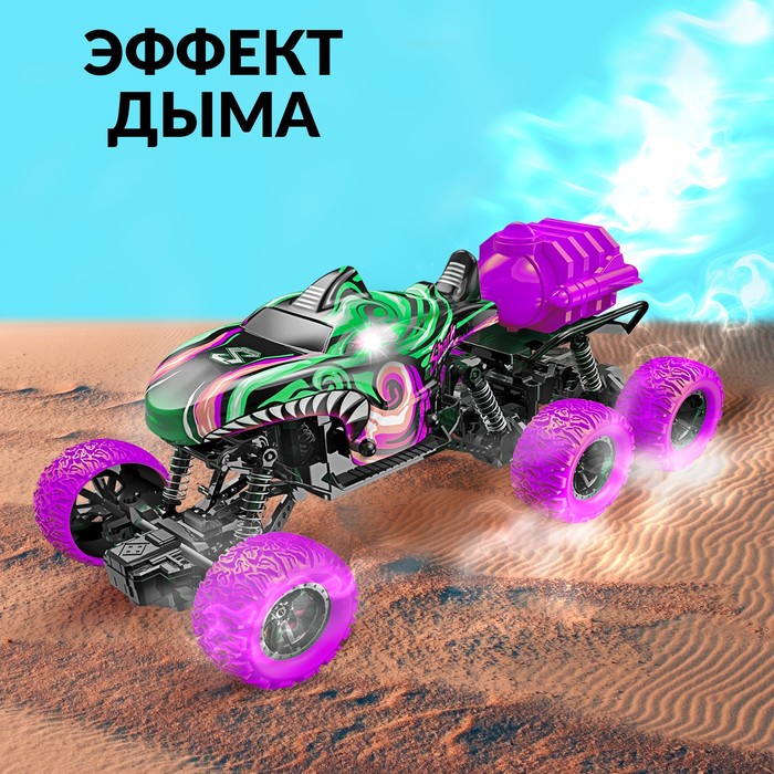 Радиоуправляемая машина-вездеход с дымовыми эффектами способна проехать там, где для легковых авто дороги нет! Шесть больших колёс и высокая пружинная подвеска помогут преодолеть любые препятствия.