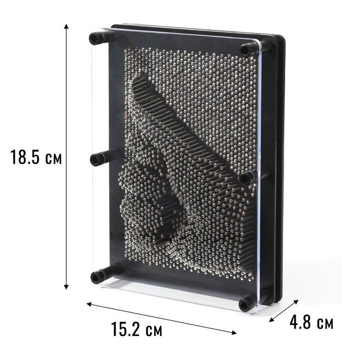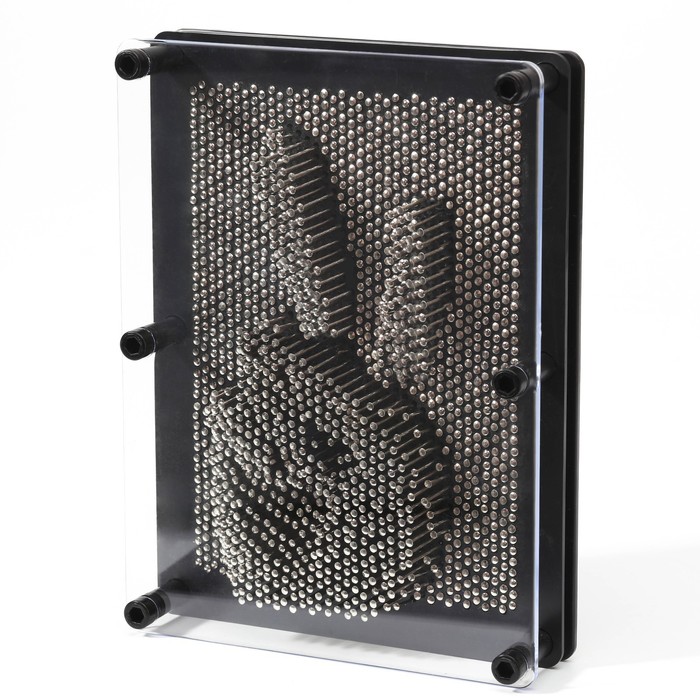 Экспресс-скульптор "PinART", 15.2 х 4.8 х 18.5 см — прибор, представляющий собой пластину-основание, на которой закреплены несколько сотен металлических стерженьков-гвоздиков, закрытых прозрачной передней панелью.