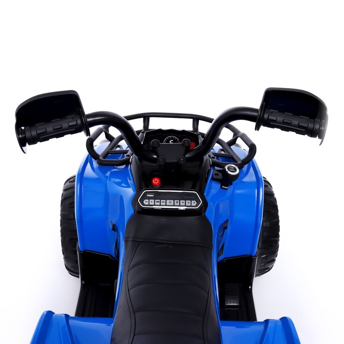 - Ребёнок может самостоятельно управлять квадроциклом. Кнопка включения находится на приборной панели, педаль газа — на правой подножке.