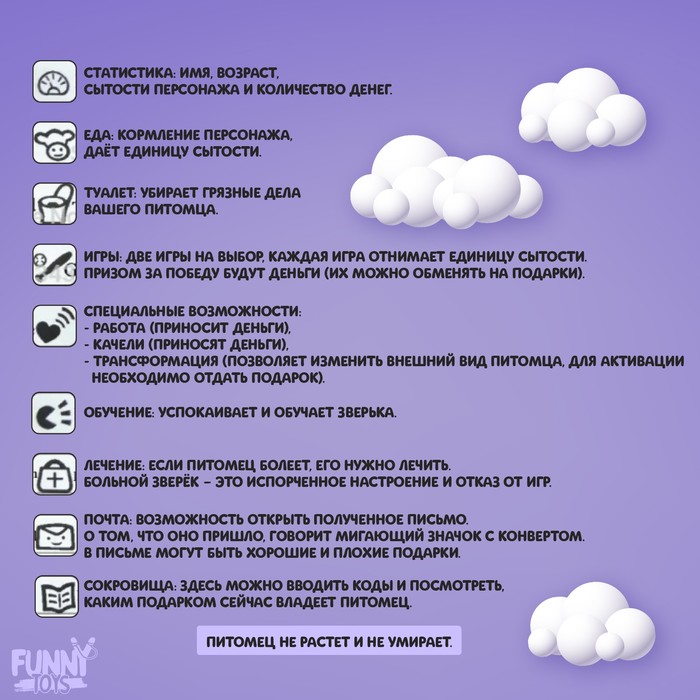 Игрушка позволяет заботиться о виртуальном друге: кормить, развлекать и следить за его состоянием. Для этого нужно вовремя реагировать на его запросы и участвовать в интерактивной мини-игре. Удобное управление и понятный интерфейс делают процесс приятным и лёгким.
