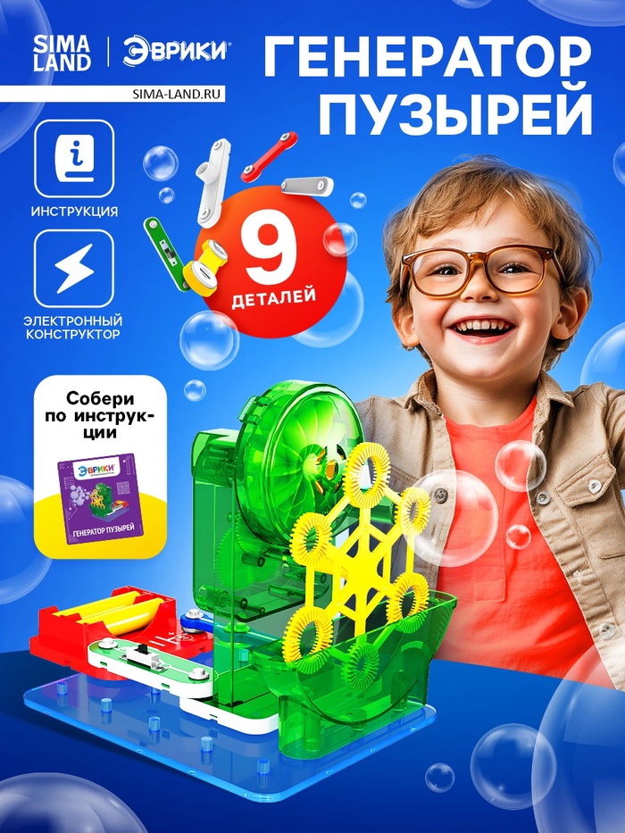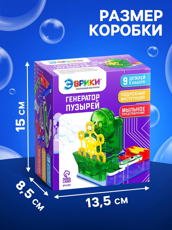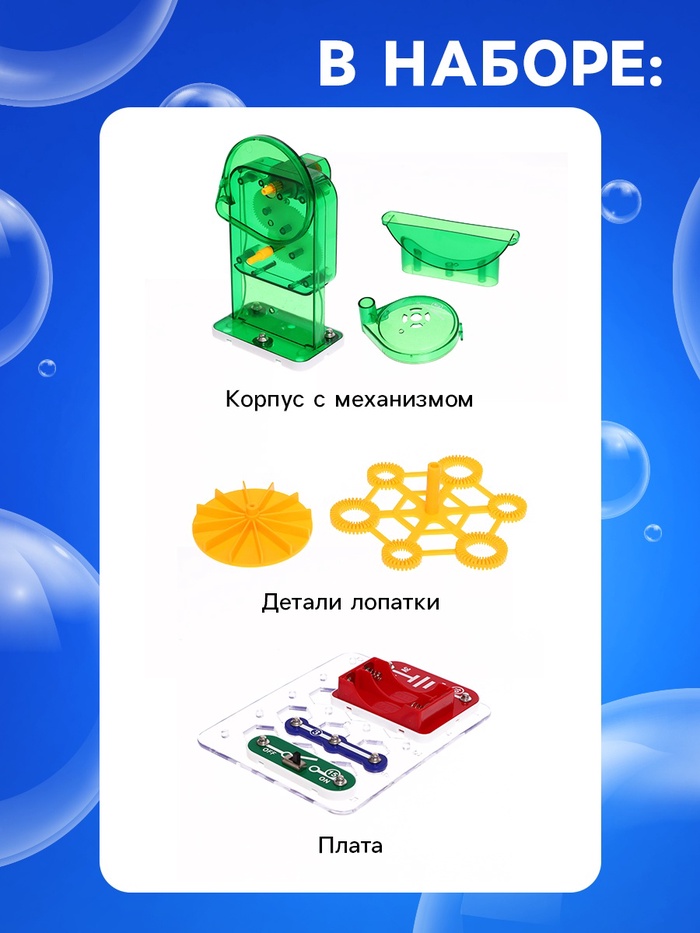 - Набор имеет красочную инструкцию: по ней ребёнок самостоятельно соберёт схему «Генератор пузырей» и испытает её!