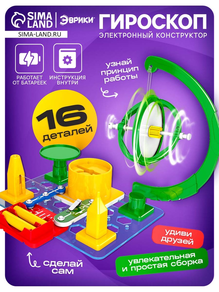 С этим набором ребёнок будет экспериментировать и создавать электрические устройства самостоятельно. Конструктор «Эврики» предназначен для сборки различных простых электронных схем. Соединение элементов между собой производится с помощью специальных кнопочных креплений — это удобно, легко и быстро. Собранные схемы не требуют настройки и работают сразу.