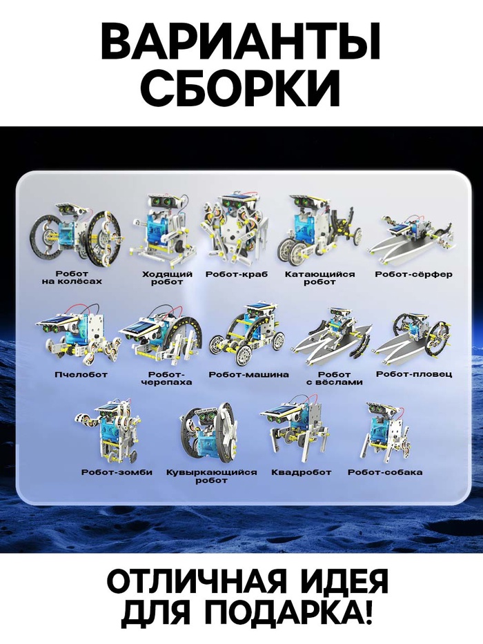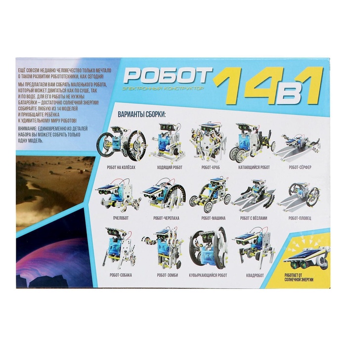 Малыш любит играть, но не любит учиться? С набором для опытов «Робот 14 в 1» ребёнок сам сможет сделать необычного многофункционального робота и при этом изучить основы физики.