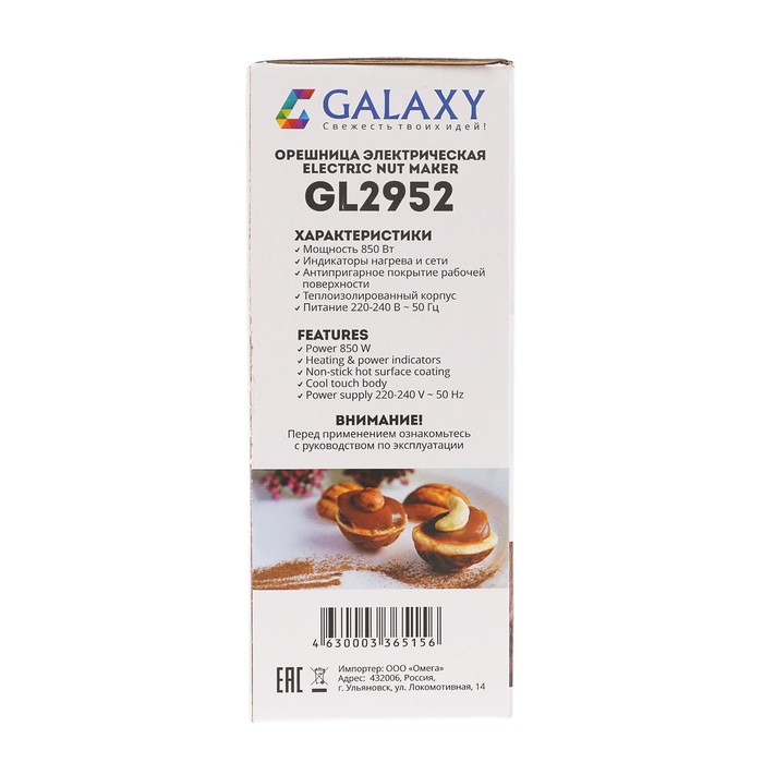 Вафельница электрическая GALAXY GL2952 предназначена для приготовления печенья «орешки». Имеет антипригарное покрытие рабочей поверхности. Оснащена индикатором нагрева и сети.