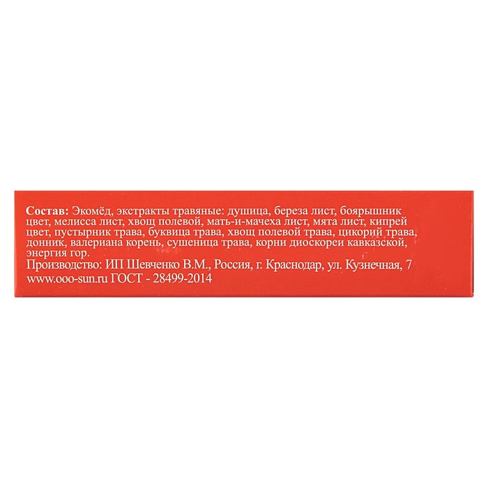 Состав: кавказский высокогорный мед, экстракты медовые: душица, листья берёзы, цветы боярышника, листья мелиссы, полевой хвощ, листья мать-и-мачехи, листья мяты, цветы кипрея, пустырник, буквица, полевой хвощ, цикорий, донник, корень валерианы, сушеница, корень диоскореи.