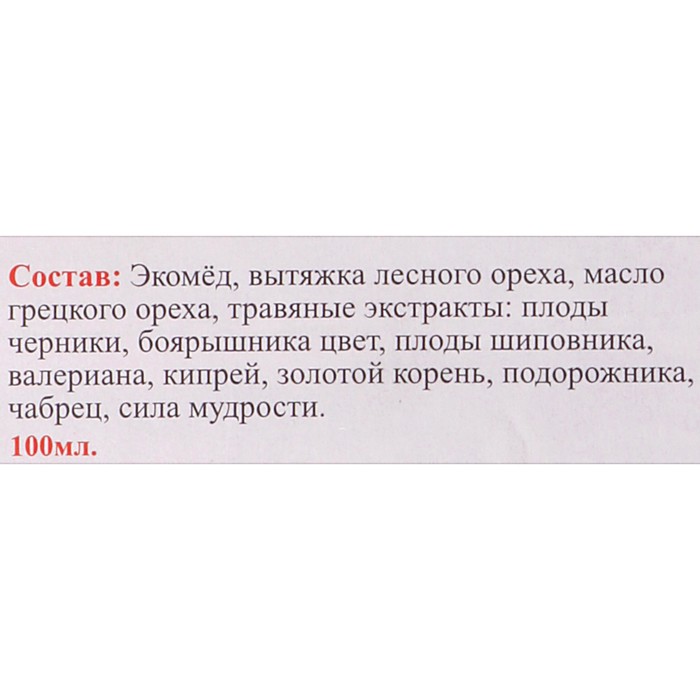 Состав: кавказский мёд, вытяжка лесного ореха, масло грецкого ореха, медовый экстракт: плоды черники, цвет боярышника, плоды шиповника, валериана, кипрей, золотой корень, подорожник, чабрец.