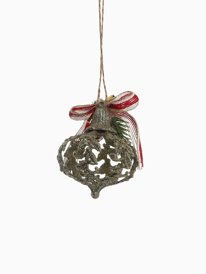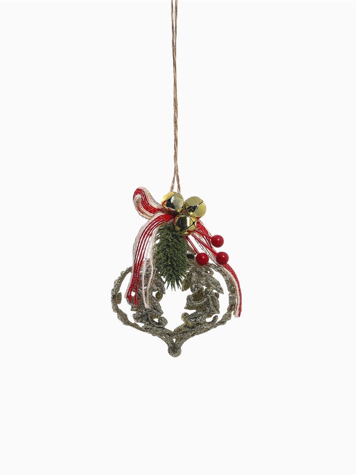 Золотистое ёлочное украшение в форме фруктово-овощного мотива выполнено с резным узором в стиле новогоднего барокко. Лёгкий пластиковый элемент добавляет изящества и глубины праздничному оформлению, подчёркивая традиционную атмосферу зимних праздников.