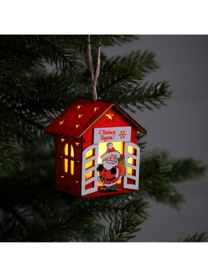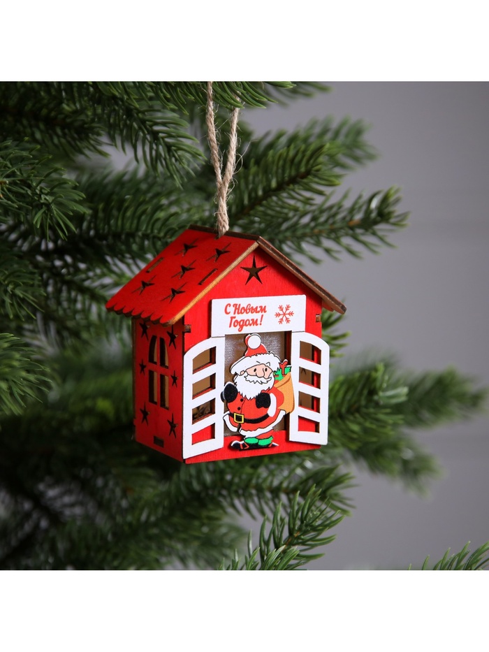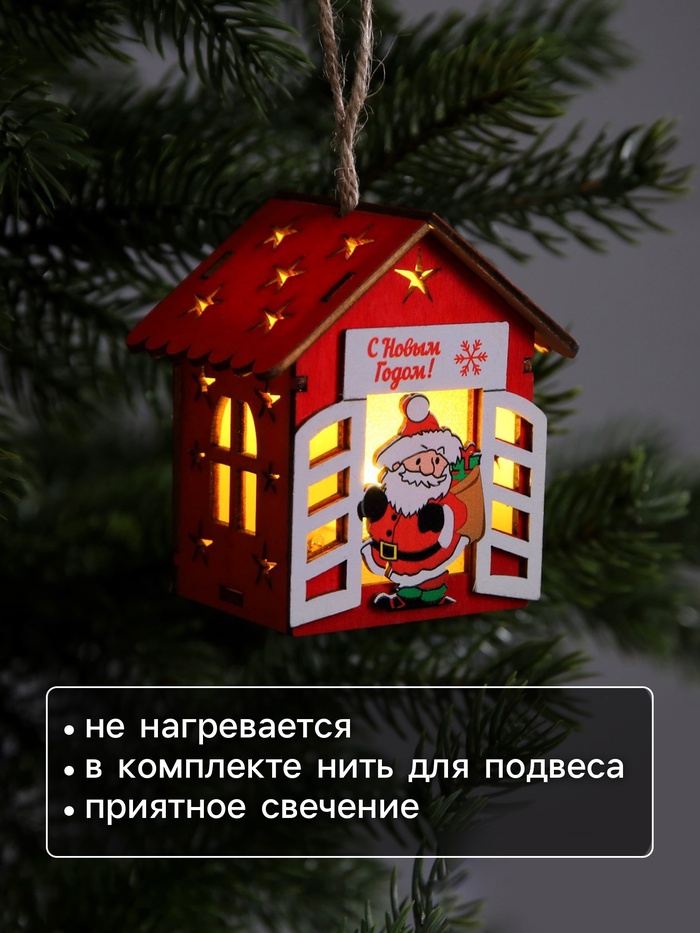 Изготовленный из натурального дерева, домик с Дедом Морозом освещает пространство тёплым белым сиянием, создавая атмосферу уюта и волшебства. Встроенный светодиод, работающий от батареек, позволяет разместить игрушку в любом месте — будь то ветки ёлки или полки в вашем доме. Компактные размеры 8x7x6 см делают её удобной для размещения и достаточно заметной.