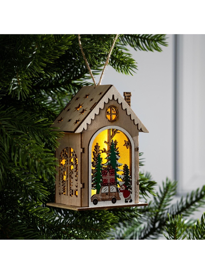 Ёлочная игрушка «Домик с Дедом Морозом и машиной», от батареек, свечение тёплое белое