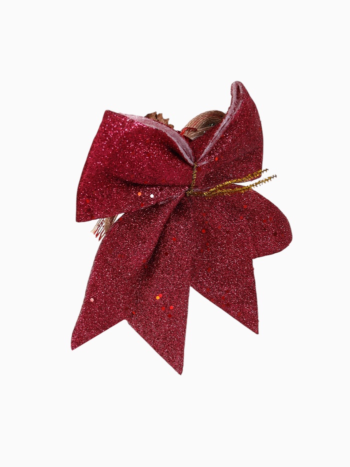 Текстильный бордовый бант с декоративными элементами в виде шишек и ягод станет выразительным дополнением новогоднего декора. Его мягкая фактура и стиль фьюжн сочетают традиционные мотивы с современными акцентами, создавая праздничное настроение и уют.