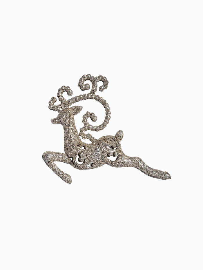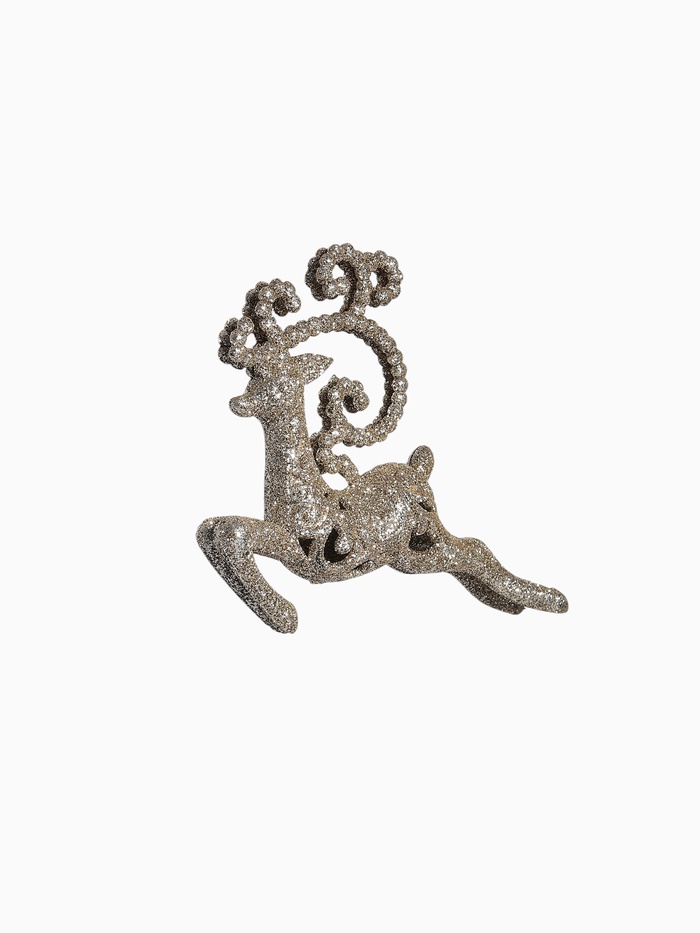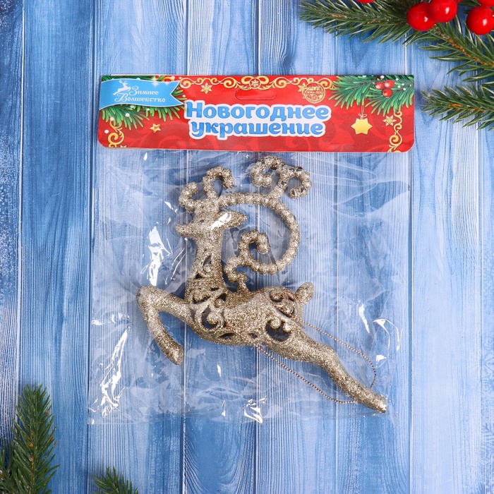 Золотистая резная фигурка бегущего оленя станет изысканным акцентом в новогоднем оформлении. Компактный размер 13×11 см позволяет использовать украшение как на ёлке, так и в праздничных композициях, объединяя классический стиль с элементами барокко и ар-деко.