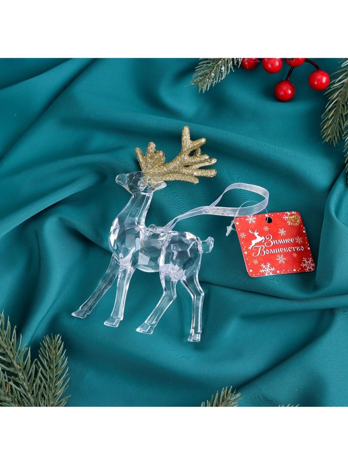 Пусть на вашей ёлке поселится зимний гость с лёгкими шагами. Ёлочная игрушка «Олень с блеском» — это образ природы, застывшей в праздничном свете. Прозрачный силуэт животного с золотистыми бликами создаёт ощущение морозного узора, будто зверь вышел из снежной сказки, чтобы стать частью вашего Нового года.