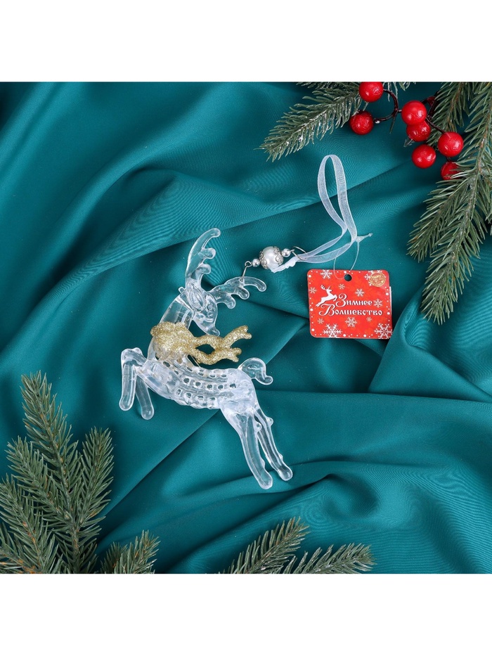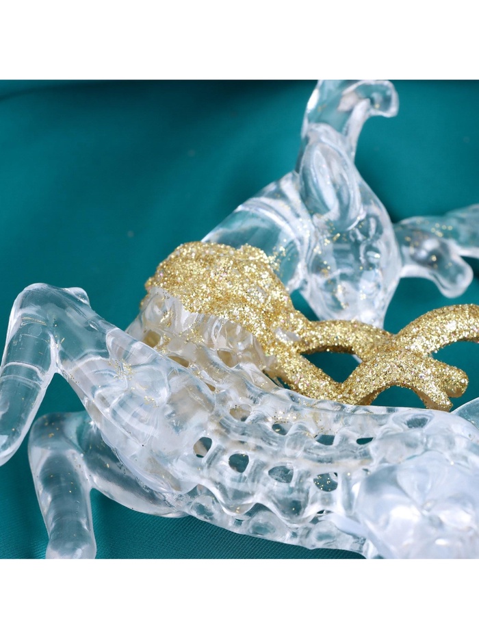 Прозрачная золотистая фигурка оленя в динамичной позе добавит изящества и лёгкости новогоднему декору. Эта игрушка в классическом и барочном стилях украшает ёлку, создавая атмосферу праздничного движения и светящегося настроения.