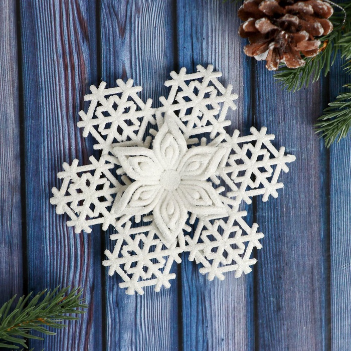 Белая снежинка диаметром 12 см — изящное украшение для новогодней ёлки в духе классики и скандинавского минимализма с элементами ар-деко. Резной узор подчёркивает утончённость и добавляет текстурную глубину, создавая атмосферу зимнего уюта и праздничной свежести.