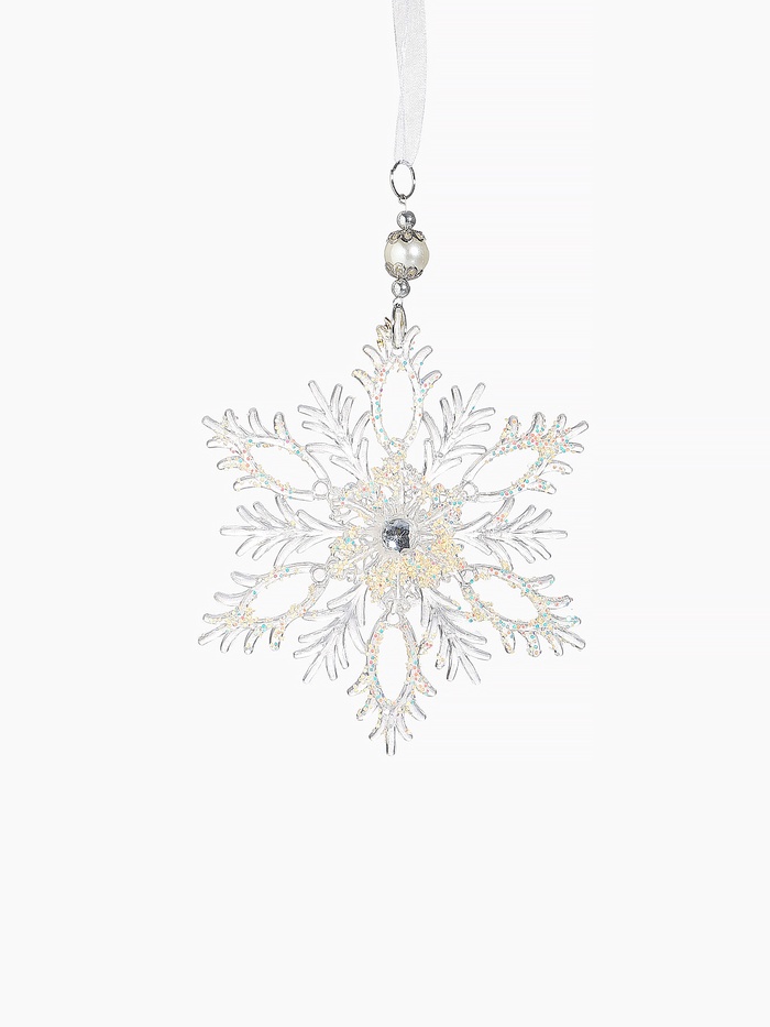 Прозрачная снежинка с резным узором добавит изящества в оформление новогодней ёлки. Классический и ар-деко стили гармонично сочетаются в этой игрушке, подчёркивая атмосферу зимнего праздника.