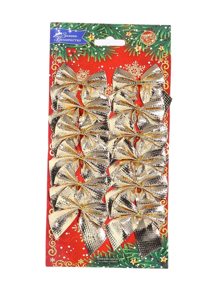 Ёлочные игрушки «Бантик», 5 см, 12 шт., золотистые, текстиль — это роскошный и мерцающий акцент для новогоднего оформления. Набор миниатюрных бантов подходит для ёлки, гирлянды или декора интерьера — классическое решение для тех, кто ценит торжество, порядок и атмосферу настоящего праздника без излишеств.