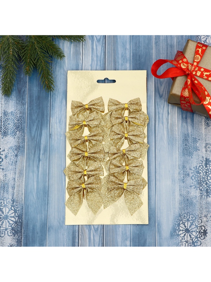 Ёлочные игрушки «Бантик с блеском», 4,5×5,5 см, 12 шт., золотистые, текстиль — это тёплый и торжественный акцент для новогоднего оформления. Набор миниатюрных бантов с мягким сиянием подходит для ёлки в классическом стиле, гирлянды или праздничной композиции — элегантное решение для тех, кто ценит свет, порядок и атмосферу настоящего зимнего чуда без излишеств.
