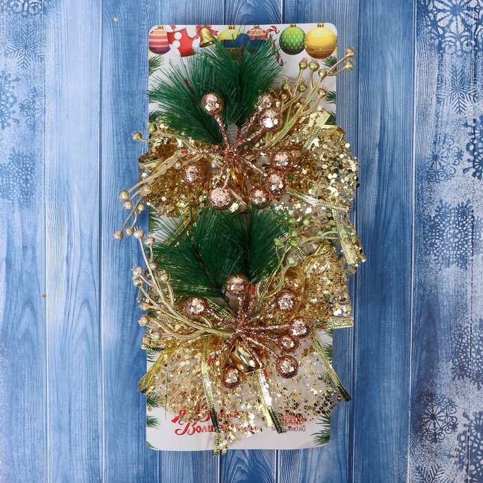 Ёлочные игрушки 2 шт. «Зимнее волшебство. Еловая композиция» пластик, бант блеск, ягодки, 13×12 см, золото