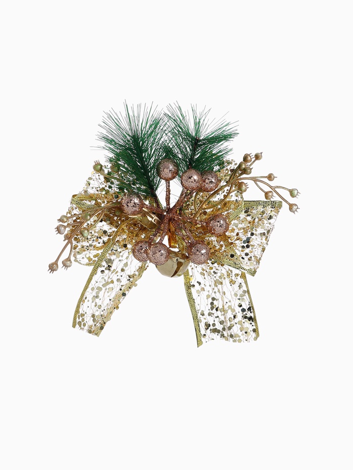 Набор из двух ёлочных украшений в виде золотистых бантов с блеском и декоративными ягодками подчёркивает стиль новогоднего барокко. Размер каждого банта — 13×12 см, а наполненная структура сохраняет объём и форму, создавая выразительный акцент в праздничном интерьере.