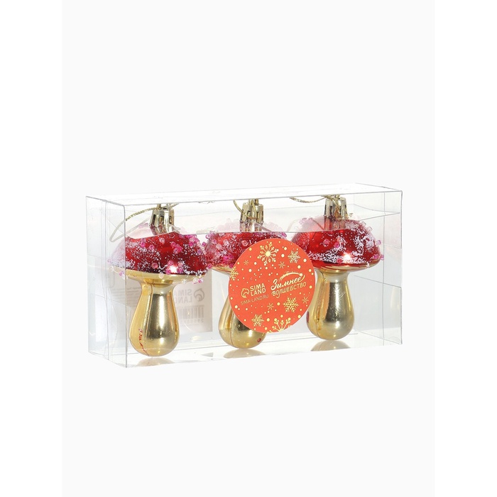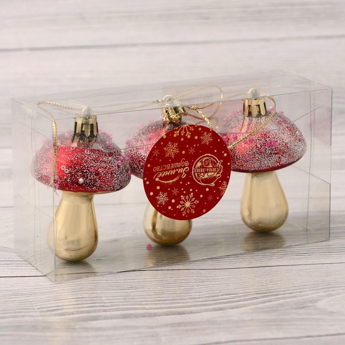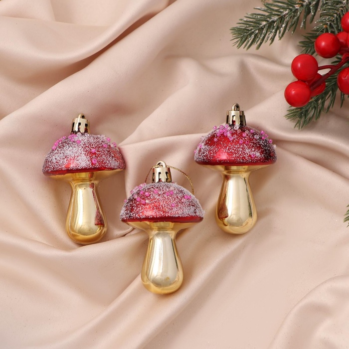 Сказка растёт прямо на вашей ёлке. Новогодние игрушки «Праздничные грибочки» — это 6 украшений золотисто-красного цвета, выполненных из прочного пластика. Игрушки в форме грибов добавляют праздничной композиции нотку волшебства и стилистической выразительности. Дизайн сочетает элементы новогоднего барокко и советской эстетики, создавая образ доброго зимнего леса в миниатюре.