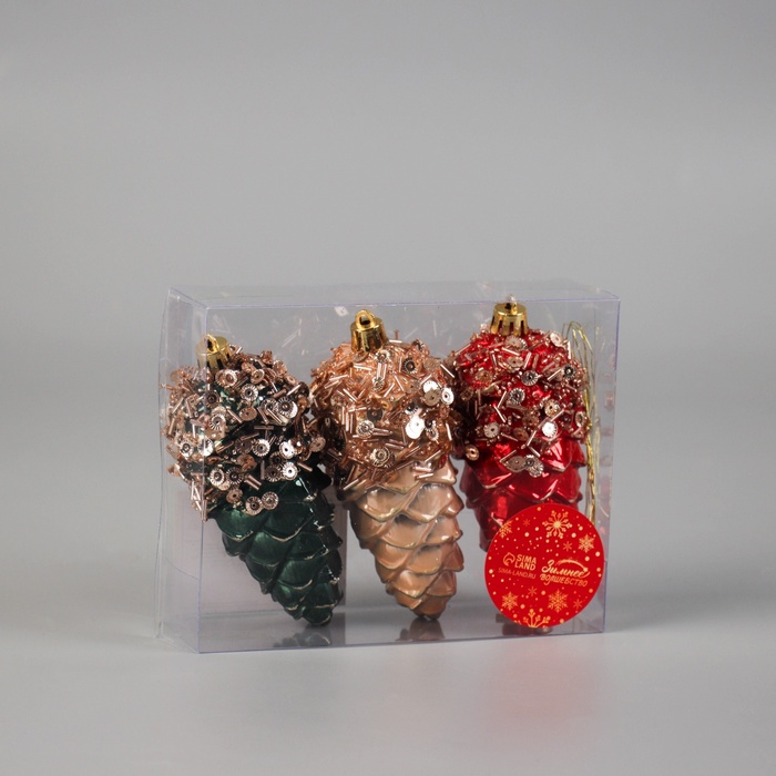 Набор из трёх разноцветных ёлочных украшений в форме шишек сочетает советский стиль и фьюжн, создавая уникальное оформление новогодней ёлки. Изделия с рисунком придают декору выразительность и глубину, отражая праздничное настроение и традиции.