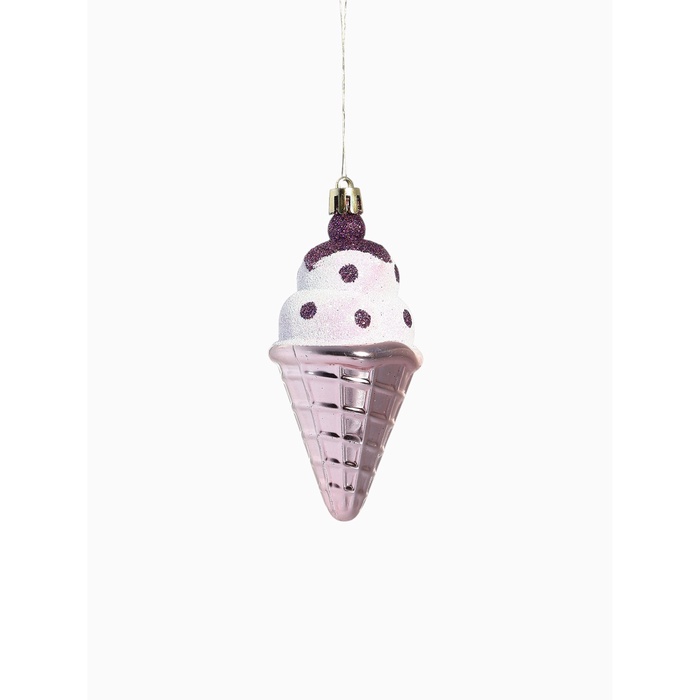 Набор из четырёх розовых ёлочных украшений в форме рожков мороженого добавит в праздничный интерьер нотки советской ностальгии и игривого настроения. Игрушки с рисунком сохраняют атмосферу традиционного новогоднего декора, сочетая яркость и простоту форм.
