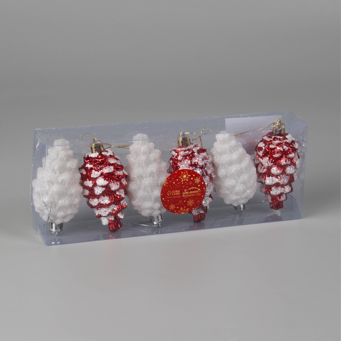 Набор из 6 ёлочных украшений в форме шишек с рисунком в красно-белой гамме сочетает советский стиль и фьюжн, добавляя оригинальные акценты в новогодний декор. Игрушки высотой 9,5 см изготовлены из лёгкого пластика, что облегчает их развешивание и хранение.