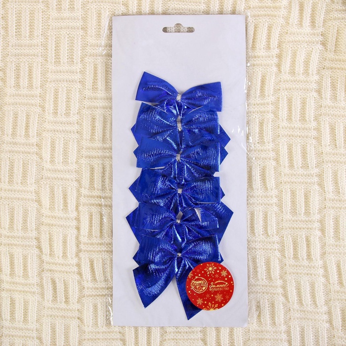 Набор из шести синих прозрачных бантиков из пластика привнесёт в новогодний декор свежесть и современность. Стиль фьюжн сочетает яркость и лёгкость, подчёркивая индивидуальность праздничного оформления. Размер 8×7 см подходит для разнообразных вариантов украшения ёлки и интерьера.