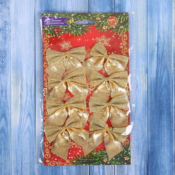 Ёлочные игрушки «Бантик с блеском», 4,5×5,5 см, 8 шт., золотистые, текстиль — это тёплый и торжественный акцент для новогоднего оформления. Набор компактных бантов с мягким сиянием подходит для ёлки в классическом стиле, гирлянды или праздничной композиции — элегантное решение для тех, кто ценит свет, порядок и атмосферу настоящего праздника без излишеств.