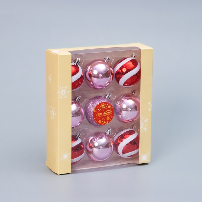Набор из 9 ёлочных шаров среднего размера с полосатым рисунком в красно-розовой гамме объединяет праздничный стиль фьюжн и современную эстетику. Эти пластиковые украшения создают живое и динамичное настроение, подчёркивая индивидуальность новогоднего декора.