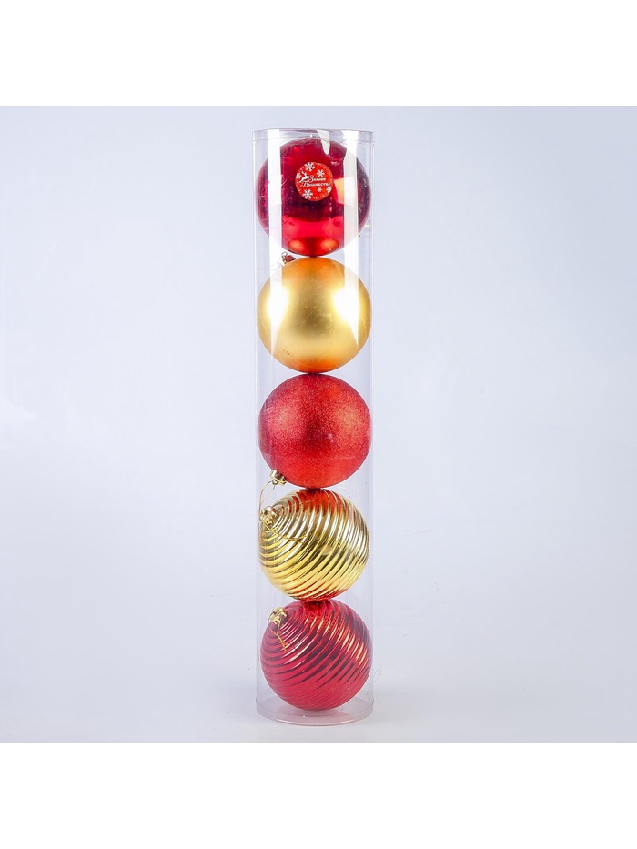 - Пять шаров разного дизайна создают законченную композицию на новогодней ёлке