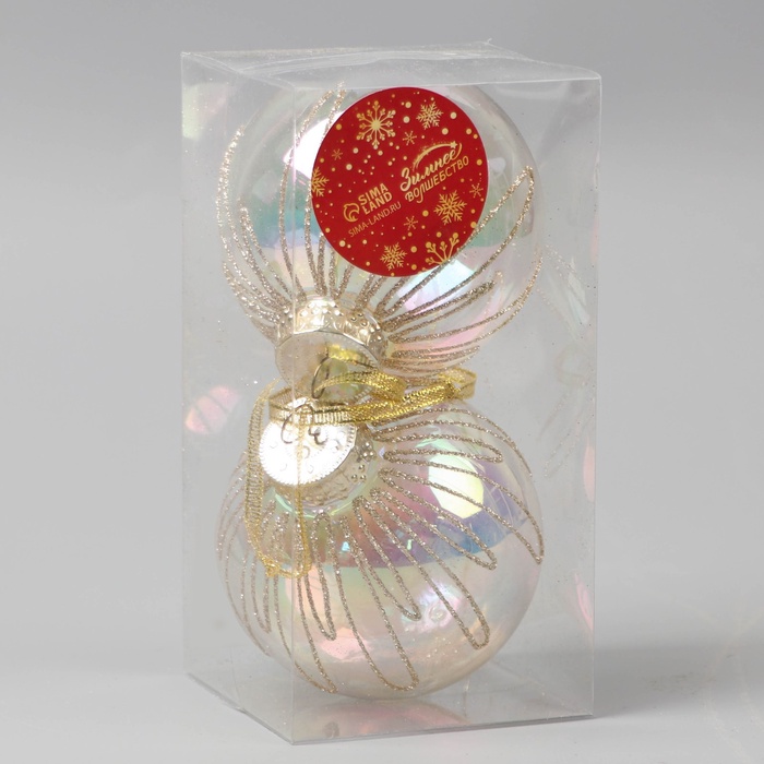 Новогодние шары «Фейерверк» — это пара украшений диаметром 8 см из прочного пластика. Прозрачная поверхность дополнена праздничным рисунком, создающим ощущение движения и сияния. Изделия выполнены в классическом стиле с элементами ар-деко и станут ярким акцентом на ёлке, напоминая о праздничном салюте.